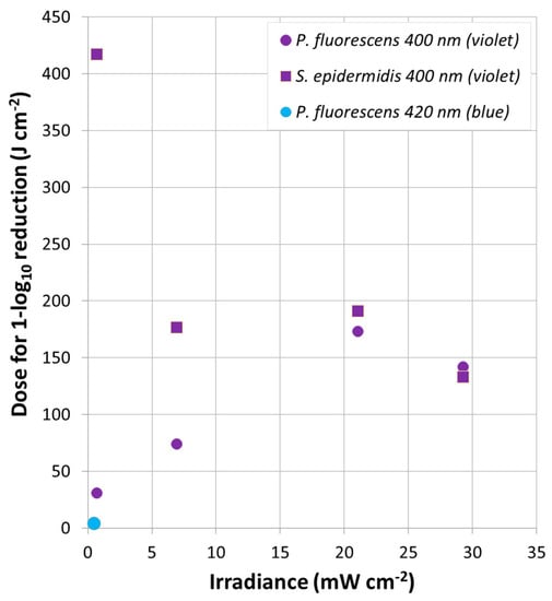 2.5. Inactivation by Light and Dose for 1-log10 Reduction