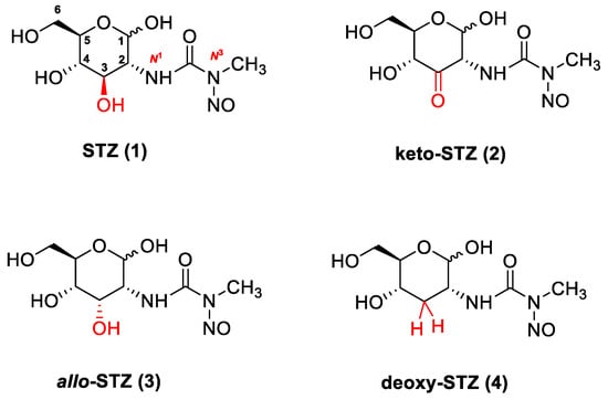 Structures of Streptozotocin (STZ) (1), and the STZ-derivatives (2–4) synthesized and evaluated in this project.