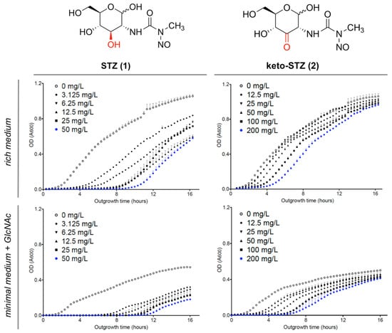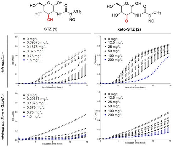 Growth curves of E. coli to determine the MIC value for STZ 1 (top left) and keto-STZ 2 (top right) in rich medium, and for STZ 1 (bottom left) and keto-STZ 2 (bottom right) in minimal medium + GlcNAc. Experiments are performed in triplicate.