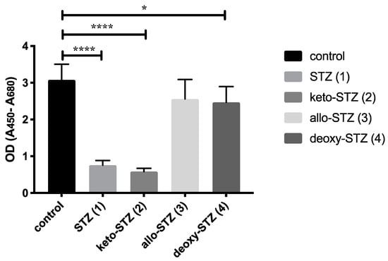 From the antimicrobial assays above it is clear that the parent STZ (1) remains the most active in inhibiting bacterial growth, while keto-STZ (2) and allo-STZ (3) showed moderate to poor activity. As an important goal of this project is to understand the structural motifs important for antimicrobial and cytotoxic activities, we explored the toxicity of compounds 1–4 on insulin-producing β cells. Using the WST-1 dye as a colorimetric read-out of cell proliferation and mitochondrial activity, the effect of compounds 1–4 was measured, as depicted in Figure 4. Compared to the negative inhibition control (incubation with citrate), STZ (1) shows a large reduction in β cell viability. Unfortunately, this result is mimicked by keto-STZ (2), which shows a similarly high cytotoxicity. In contrast, allo-STZ (3) and deoxy-STZ (4) show a negligible amount of cytotoxicity in this assay.
