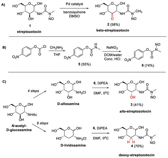 (A) One-step preparation of keto-STZ (2); (B) Synthesis of the N-nitrosocarbamate 6; (C) Synthesis of analogues 3 and 4 starting from N-acetyl-d-glucosamine using late-stage methyl nitrosourea introduction to d-allosamine and d-lividosamine [32].