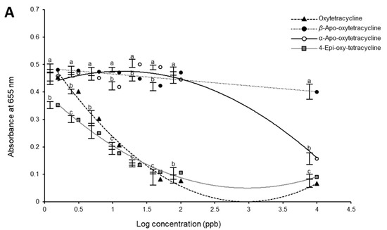 Oxytetracycline ACCEL ELISA kit was purchased from Plexense, Inc., (Davis, CA, USA). Oxytetracycline metabolites (4-epi-oxytetracycline, α-apo-oxytetracycline, and β-apo-oxytetracycline) were purchased from Fisher Scientific (Pittsburgh, PA, USA). Stock solutions (1 mg mL−1) of the oxytetracycline metabolites were prepared by dissolving 10.0 mg in 10.0 mL 0.1 N HCl. The stock solutions were diluted using the dilution buffer provided with the kit to prepare the following concentrations (10,000.0, 100.0, 50.0, 25.0, 12.50, 6.25, 3.13, 1.56 ng mL−1). The oxytetracycline stock solution (1 mg mL−1), provided with the kit, was also diluted in the same manner using the dilution buffer. The ELISA assay for oxytetracycline and its metabolites was performed according to the manufacturer’s instruction. Briefly, 120 µL of the standard was mixed with 120 µL of diluted enzyme horseradish peroxidase (HRP)-conjugate (500-fold dilution). Three mixtures were prepared for each concentration. An aliquot (100 µL) of the mixed solution was transferred into ACCEL ELISA strip and was incubated for 30 min at room temperature. At the end of the incubation time, the mixture was discarded, and the wells were washed six times with the diluted washing buffer (20-fold dilution). After discarding the washing buffer, 100 µL of the substrate solution was added and incubated for 15 min at room temperature. At the end of 15 min, the absorbance was measured using a microplate reader at 655 nm. Statistical analysis was performed using JMP 9.0 software (SAS, Cary, NC, USA). Comparison among the mean response (absorbance) of the four compounds was performed by one-way analysis of variance (ANOVA), followed by posthoc pairwise comparison using Tukey’s honestly significant difference (HSD) test (p-value < 0.05).