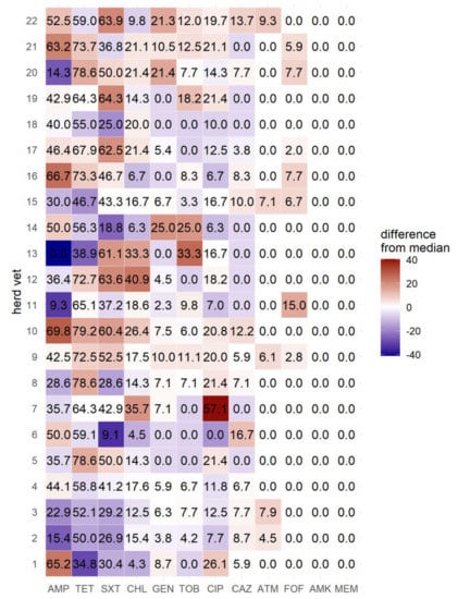 Frequency of resistant E. coli isolates by herd veterinarian (in %). AMP = ampicillin; TET = tetracycline; SXT = trimethoprim-sulfamethoxazole; CHL = chloramphenicol; CIP = ciprofloxacin; GEN = gentamicin; TOB = tobramycin; CAZ = ceftazidime; ATM = aztreonam; FOF = fosfomycin; AMK = amikacin; MEM = Meropenem.