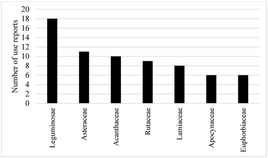 Numbers of use reports of the top seven families having the highest use report for fever treatment by 25 Karen villages in Thailand.