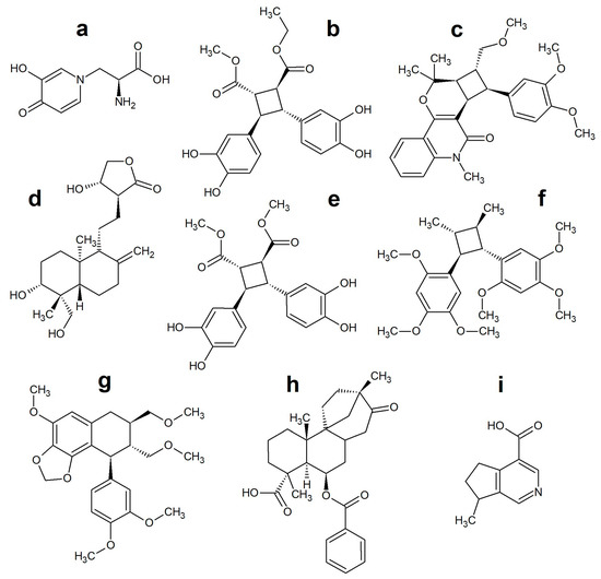 Molecular structures identified as having a potential value in the search for drugs to combat fever or associated pathogens: (a) L-mimosine, (b) 3,4,3′,4′-hydroxy-δ-truxinate, (c) melicodenine D, (d) andrographolide, (e) dimethyl-3,4,3′,4′-hydroxy-δ-truxinate, (f) acoradin, (g) hypophyllanthin, (h) scopadulcic acid B, (i) plantagonin.