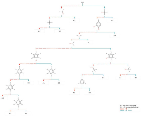 The 74 flavonoids were partitioned using a decision tree (Figure 2). In this tree, the ‘root’ node corresponds to the total set of flavonoids. The flavonoids were successively divided into smaller and smaller subsets, according to the presence or absence of a ‘distinctive’ fragment. The ‘X’ symbol indicates an atom that is not hydrogen and all hydrogen atoms in fragments containing ‘X’ (shown or implied) must be exactly the same. All other fragments have unspecified hydrogen and non-hydrogen atom substitution patterns. At each node in the tree, the J48 algorithm chooses the fragment that most effectively divides its set of samples into subsets of a class [35,36,37]. At the conclusion of the process, the selected fragments in the tree nodes may be the properties or characteristics of the class, such as, for example, the pharmacophore of chemical structures or the fraction that prevents biological activity.