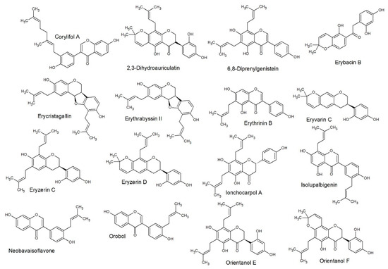- Tanaka, H.; Sudo, M.; Tomoko, K.; Sato, M.; Yamaguchi, R.; Fukai, T.; Sakai, E.; Tanaka, N. Antibacterial constituents from the roots of Erythrina herbacea against methicillin-resistant Staphylococcus aureus. Planta Med. 2010, 76, 916–919. [Google Scholar] [CrossRef]