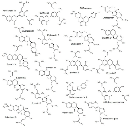 - Mitscher, L.A.; Okwute, S.K.; Gollapudi, S.R.; Drake, S.; Avona, E. Antimicrobial pterocarpans of Nigerian Erythrina mildbraedii. Phytochemistry 1988, 27, 3449–3452. [Google Scholar] [CrossRef]