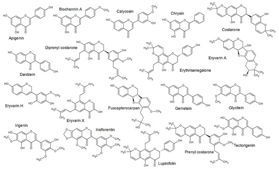 - Tanaka, H.; Sato, M.; Oh-Uchi, T.; Yamaguchi, R.; Etoh, H.; Shimizu, H.; Sako, M.; Takeuchi, H. Antibacterial properties of a new isoflavone from Erythrina poeppigiana against methicillin-resistant Staphylococcus aureus. Phytomedicine 2004, 11, 311–337. [Google Scholar] [CrossRef]