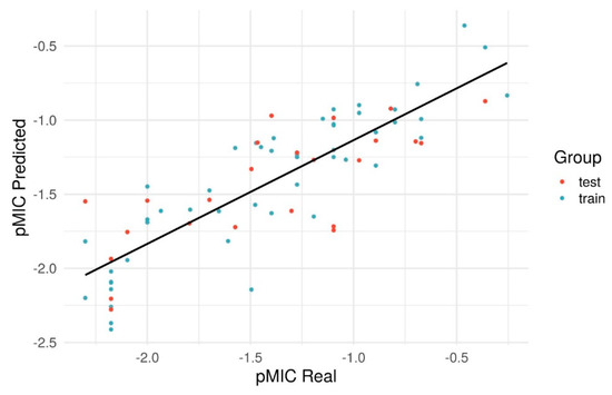 In Figure 7, we show the linear relationship between the predicted-log of the MIC (pMIC) and the real pMIC and proven in Table 2. The numerical pMIC values can be seen in Table 3, Table 4, Table 5 and Table 6. The regression equation that obtained these results for the pMIC was:
