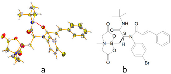 (a) Asymmetric unit of 5a. Thermal ellipsoids at RT were drawn at the 30% probability level (C: gray; H: white; O: red; N: blue; B: purple; Br: dark green). The only relevant NH–O intramolecular hydrogen bond is highlighted as a red dashed line. (b) Molecular structure of the S-5a enantiomer (also the R enantiomer is present in the crystal in a 1:1 ratio) [26].