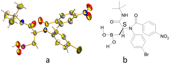 The free boronic acids 6a–p proved to be quite stable towards the common protodeborylation reaction [27] and were fully characterized by means of HR-MS, 1H, 13C, and 11B-NMR. A single-crystal X-ray diffraction analysis was performed on 6d, as reported in Figure 2. Unlike 5a, the free β-aminoboronic acid 6d contains strong hydrogen bond donors B-OH, which are all involved in extended ribbons networks in the solid state.