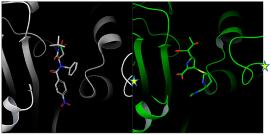 3D comparison between the predicted binding mode of compound 6e (on the left) and the X-ray structure of the OXA-23/meropenem complex (on the right panel). The secondary structure of the enzyme is shown as a cartoon. The yellow stars highlight the position of Phe110. The 3D structures of the complexes were previously structurally aligned and superimposed; here they are displayed in two panels for clarity. The last frame of MD simulations of the 6e/OXA-23 complex is represented on the left.