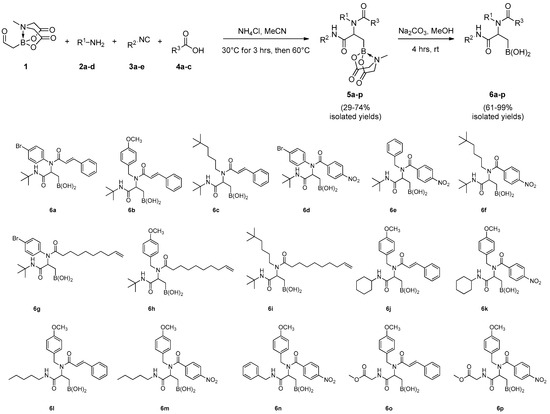 Scope of the Ugi-4CRaa synthesis of compounds 5a–p: all reactions were performed using MIDA-protected α-boryl aldehyde 1 (0.6 mmol), amine 2 (0.7 mmol), carboxylic acid 4 (0.7 mmol), NH4Cl (1.0 mmol), and isocyanide 3 (1.0 mmol) in MeCN (6 mL), under heating (30–60 oC) for 24 h. Synthesis of compounds 6a–p: all reactions were performed using compounds 5a–p (0.5 mmol) and solid Na2CO3 (9.0 mmol) in MeOH (7 mL), at room temperature, for 4 h.