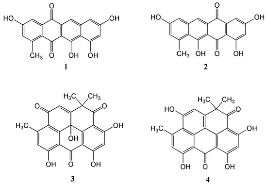 Mersaquinone (1) was isolated as a red amorphous powder and its molecular formula was assigned as C19H12O6 based on HR-ESI-MS data ([M+H]+ at m/z 337.0714, Figure S1). The UV spectrum of 1 measured in MeOH exhibited absorption bands at 218, 277, 308, 350, 480, 515 and 550 nm, indicating the presence of an anthraquinone moiety [25]. The IR spectrum of 1 showed absorption bands for OH (3475 cm−1) and carbonyl groups (1685 cm−1). The 1H NMR spectrum (Figure S2) showed five aromatic methine signals at δH 7.75 (s), 7.45 (br d, J = 2.2 Hz), 7.00 (br d, J = 2.2 Hz), 6.84 (br d, J = 1.8 Hz), and 6.51 (br d, J = 1.8 Hz) and one methyl group at δH 2.70. The 13C NMR spectrum (Figure S3), and gHSQC NMR spectrum (Figure S4) of 1 displayed 19 carbon signals composed of two carbonyl carbon signals (δC 186.4, and 181.8), 11 quaternary sp2 carbon signals (δC 162.2, 162.0, 158.0, 157.8, 137.7, 145.2, 138.9, 122.6, 109.7, 106.1, and 128.0), five aromatic methine carbon signals (δC 124.8, 120.2, 112.2, 106.4, and 104.7), and one methyl signal (δC 23.9). The 1H-1H COSY NMR spectrum (Figure S5) displayed correlations of δH 7.45 (H-4) and 7.00 (H-2), and of δH 6.84 (H-7) and 6.51 (H-9), which showed long-range meta spin-spin coupling constants in the 1H NMR spectrum. In the HMBC spectrum (Figure S6), the two meta coupled protons signals showed long-range HMBC correlations from H-2 to C-4, C-13 and C-12a, H-4 to C-2, C-5, and C-12a, H-7 to C-6, C-9, and C-10a, and H-9 to C-7, C-8, C-10, and C-10a. Additionally, the aromatic methine proton H-6 correlated to C-5, C-6a, C-10a, and C-11a (Figure 2). These results indicated the presence of a 3,8,10,11-tetrahydroxy-1-methyltetracene-5,12-dione ring system. Based on the above spectroscopic data, the full planar structure of Mersaquinone (1), was confirmed as shown in Figure 1. The known compounds 2–4 were identified by comprehensive NMR and MS analysis (Table S1 and Figures S7–S17).