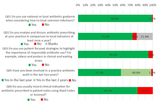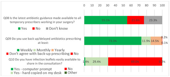 Areas with scope for improvement include developing strategies to help patients avoid reconsulting to obtain antibiotics, as fewer than half of the responded reported this. Nearly two-thirds of the respondents had not undertaken any antibiotic-related learning course in the last two years. Additionally, ensuring all temporary prescribers have access to antibiotic guidance could be improved, as nearly half of them reported that the guidance was not made available or they did not know about it. Similarly, having easily available patient information leaflets in consultations was reportedly low.