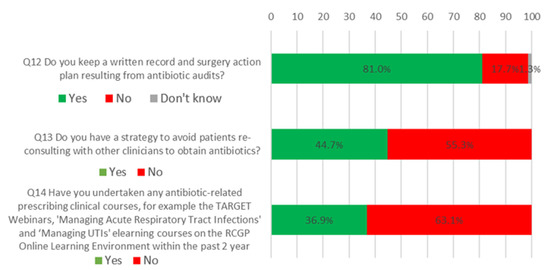 Most respondents (81.0%, 1923) reported keeping a written record and surgery action plan resulting from antibiotic audits. Those who worked in ‘other’ locations had significantly lower odds of keeping written records and a surgery action plan compared to those in a GP practice (OR = 0.43, CI = 0.26–0.73). Under half of the respondents (44.7%, 1061) reported having a strategy to avoid patients reconsulting with other clinicians to obtain antibiotics. Only 37% of respondents (875) reported undertaking an antibiotic-related prescribing clinical course. For a visual summary of this section, see Figure 3.