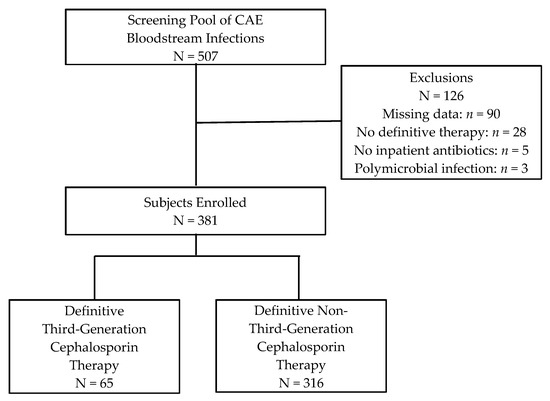 This was a multicenter, retrospective, observational cohort study conducted in hospitalized patients. Study sites were enrolled from within the SERGE-45 network and represented 18 institutions from across the Southeast. The study protocol was approved by the local institutional review board (IRB) within the Prisma Health System, which served as the coordinating site for the study (IRB identification code Pro00039225, approval date 22 October 2014). Patients with blood cultures that were positive for select CAE organisms (i.e., Enterobacter, Serratia, or Citrobacter spp.) between 1 January 2006 and 1 September 2014 were screened for study inclusion. This included Enterobacter aerogenes (now known as Klebsiella aerogenes). The earliest positive blood culture was deemed the index blood culture. Additional inclusion criteria were patient age ≥18 years and initiation of antibiotic therapy following positive blood culture. Exclusion criteria included polymicrobial BSI based on the index blood culture (exception: coagulase-negative Staphylococcus spp. or diphtheroids deemed a contaminant, as suggested by the Infectious Diseases Society of America guidelines and the treatment team), death prior to speciation or within 72 h of index blood culture, transfer from an outside hospital with previous blood culture positive for target CAE organisms, pregnancy, incarceration, previous study enrollment for a prior episode of BSI, or missing data that would preclude the appropriate determination of a study group or primary endpoint [25].