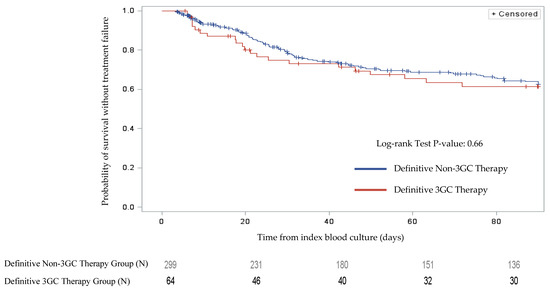 Kaplan–Meier curves for overall treatment failure by therapy group. The red line represents patients on definitive third-generation cephalosporins, and the blue line represents patients on other definitive antibiotics.