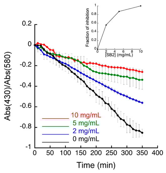 Urease activity of recombinant Escherichia coli cells in the presence of 250 μM Ni(II) and of 80 mM urea, measured as a change of pH detected by the cresol red indicator. Increasing concentrations of the sub-fraction SB2 were added to the E. coli culture before performing the colorimetric assay. Data are shown as mean ± SD of the triplicates. The insert represents the dose-response plot for the SB2 sub-fraction. Sub-fraction SB2 (90% Cyhex/EtOAc) was obtained from fraction B.
