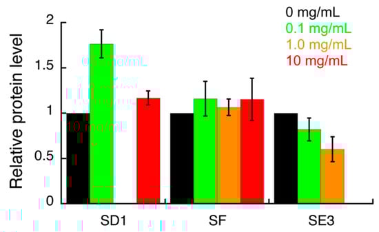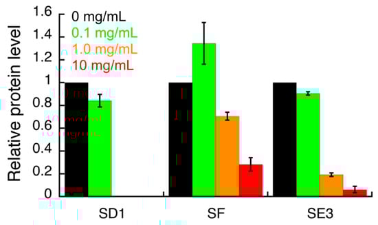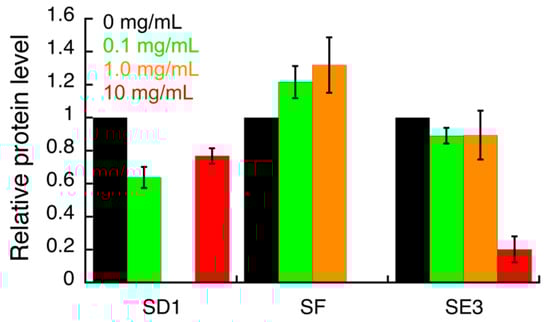 Densitometric analysis of the Western blot images (shown in the Supplementary Materials) indicating the effects of S. campanulata on H. pylori G27 BabA adhesin expression. H. pylori cells were treated with different concentrations of S. campanulata sub-fractions for 4 h and protein level of BabA adhesin was determined by Western blot, using a specific anti-BabA antibody. Values are expressed as means ± SD of two independent experiments. Sub-fraction SD1 (20% Cyhex/EtOAc), sub-fraction SE3 (70% MeOH/H2O), and sub-fraction SF (80% Cyhex/EtOAc) were from fractions D, E, and F, respectively.
