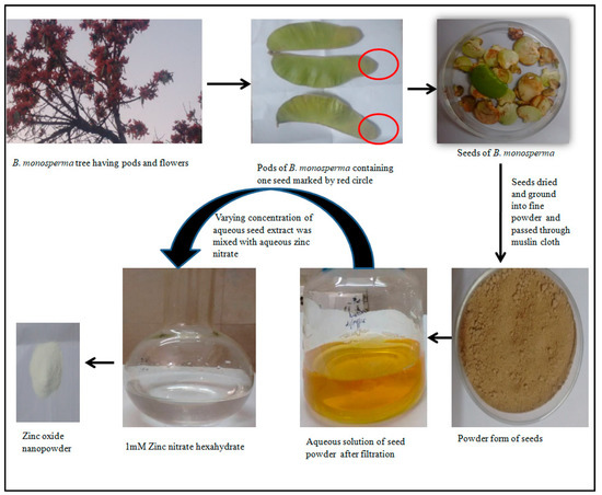 The seeds of B. monosperma were obtained from the pods and in each pod a single seed was present. Seeds were collected from different pods and sun dried to remove the water content. The air dried seeds were crushed and ground to the fine powder. 10 g of powder was dissolved in 100 mL of sterile water, and then the aqueous extract was filtered using Whatman No. 1 filter paper (Maidstone, UK) and finally passed from 0.22 µm filter (Millipore). The centrifugation at 1200 rpm for 5 min removed the heavy biomaterials and extract in aqueous form was stored at 4 °C for further use.