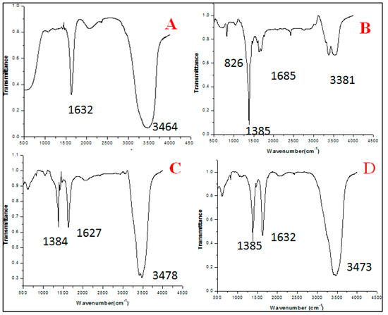 FTIR analysis between 4500–500 cm−1 showing different peaks which are representative of different bonds formed during the synthesis of zinc nanoparticles at different concentration of extract. (A) 10 mL extract, (B) 20 mL extract, (C) 30 mL extract, and (D) 40 mL extract.