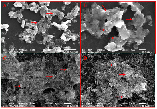 SEM of BM-ZnO NPs at different concentration of extract. (A) 10 mL, (B) 20 mL, (C) 30 mL, (D) 40 mL of extract.