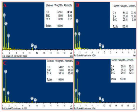 EDAX of BM-ZnO NPs at different concentration of extract. (A) 10 mL extract, (B) 20 mL extract, (C) 30 mL extract, and (D) 40 mL extract.