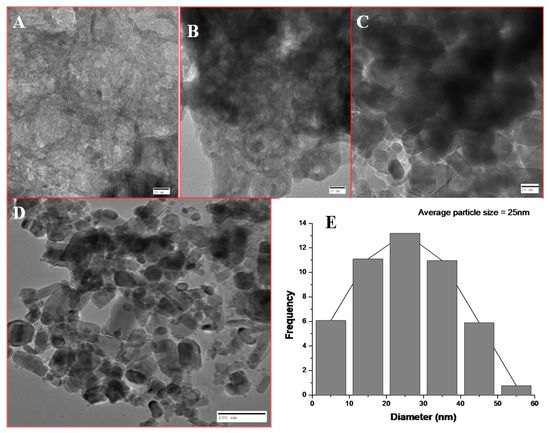 TEM of BM-ZnO NPs at different concentration of extract. (A) 10 mL extract, (B) 20 mL extract, (C) 30 mL extract, (D) 40 mL extract, (E) Average size of the nanoparticles at 40 mL extracts.