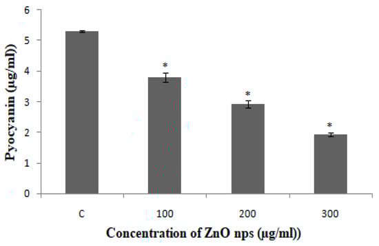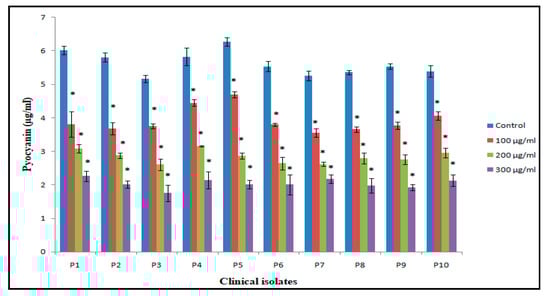 Bar graphs of clinical isolates of P. aeruginosa representing pyocyanin production (µg/mL) at three different concentrations (100, 200, 300 µg/mL) of BM-ZnO NPs along with control as untreated. * represents significance when p ≤ 0.05/mL; Error bars represent standard deviation.