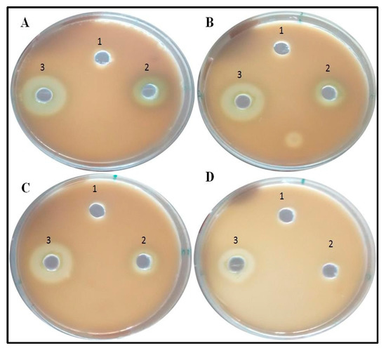Images representative of Anti-proteolytic effect of ZnO NPs. Zone size decreases as the concentration increases. Well (1) represents Nutrient Broth, well (2) PAO1 culture, and well (3) Clinical isolate. (A) Control, (B) 100 µg/mL of ZnO amended, (C) 200 µg/mL of ZnO amended, (D) 300 µg/mL of ZnO amended.