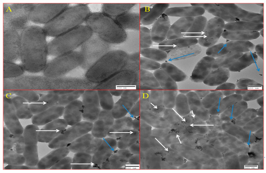 Figure 10A–D represents the localization of BM-ZnO-NPs inside the bacterial cells at sub MIC concentration i.e., 100, 200 and 300 µg/mL, respectively. It was observed that as the concentration of nanoparticles increased, there was a greater accumulation of NPs inside the cells.