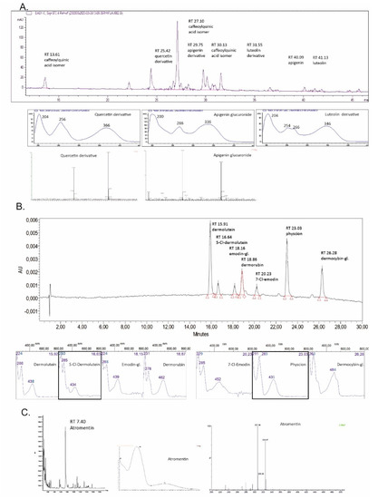 HPLC chromatogram, UV/Vis and MS spectra of the main compounds of (A) Tanacetum vulgare (HPLC detection at 370 nm), (B) Cortinarius semisanguineus (HPLC detection at 440 nm) and (C) Tapinella atrotomentosa (HPLC detection at 370 nm) extracts. Detailed data is in Table 3.