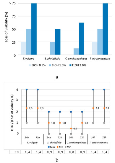 The Toxicity of the Plant and Fungal Materials. (a) The effect of EtOH concentration on the average changes in the morphology and the loss of viability% for the different EtOH dilutions. Samples of 24 h and 72 h exposure times are included. (rs = 0.863, p < 0.0005, n = 192). (b) The effect of time on the HTD values (changes in morphology and loss of viability (%) where 1 < 25%, 2 = –50%, 3 = –75%, 4 > 75%). The ranges and average values are marked in the columns and standard deviations (SD) at the bottom. The results (n = 195) include EtOH concentrations of 0.5, 1 and 2%.