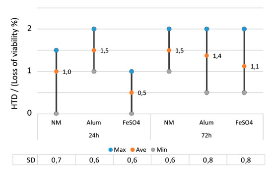 The analysis showed that iron mordant induced the fewest changes to exposed cells compared to other mordants, as shown by the lowest HTD values (Figure 4). In all the samples there was slightly more variation (max and min values) observed after the exposure time of 24 h than 72 h, showing time evening out the differences.