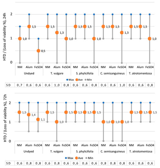 The effect of dye source, mordant and time on the HTD values (changes in morphology and loss of viability%) after 24 h (above) and 72 h (below) exposure times. EtOH dilutions of 1% and 2% are included (n = 152). NM = no mordant, SD = standard deviation.