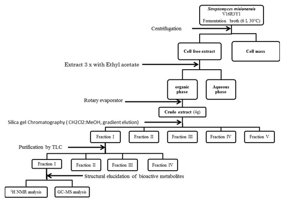 Work-up schema for the purification of the active molecules of the Streptomyces misionensis V16R3Y1.