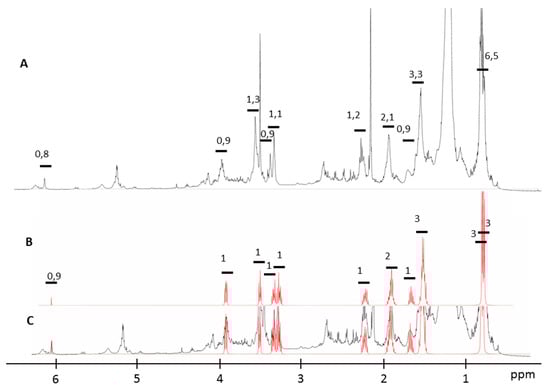 The dried TLC extract fractions were dissolved in chloroform-d. Tetramethylsilyl was used as an internal standard. Measurements were carried out at 25 °C using a Bruker AV-500 NMR instrument operating at a proton NMR frequency of 500.13 MHz. For each sample, 96 scans were recorded using the same parameters as previously reported by El Euch et al. [13]. Spectral intensities were scaled to the total intensity for the chloroform extract and reduced to the integrated regions of equal width (0.04 ppm) corresponding to the region δH1–12 ppm. The region of δH 7.18–7.3 ppm was excluded from the analyses because of the residual signal of chloroform.