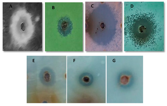 Inhibition Zone of active fraction against (A) Aspergillus niger, (B) Aspergillus flavus, (C) Fusarium oxysporum, (D) Penicillium expansum, (E) Candida albicans, (F) Escherichia fergusonii and (G) Enterococcus faecalis.