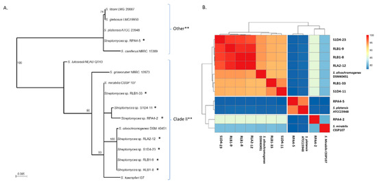 - Labeda, D.P.; Goodfellow, M.; Brown, R.; Ward, A.C.; Lanoot, B.; Vanncanneyt, M.; Swings, J.; Kim, S.-B.; Liu, Z.; Chun, J.; et al. Phylogenetic study of the species within the family Streptomycetaceae. Anton. Leeuw. Int. J. G. 2012, 101, 73–104. [Google Scholar] [CrossRef] [PubMed]