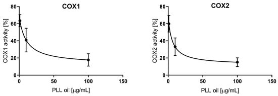 The anti-inflammatory activity, expressed as a percentage of COX-1/2 inhibition by increasing concentrations of PLL-EO (1, 10, and 100 μg/mL), allowed us to establish the IC50 values. Compared to the control sample (0 PLL-EO), where the COX-1/2 activity was considered equal to 100% (Figure 1), the IC50 values resulted as 10.3 ± 4.4 μg/mL and 6.1 ± 2.5 μg/mL for COX-1 and COX-2, respectively. These values were only seven times higher than the IC50 values of the positive control ibuprofen (1.3 ± 0.5 μg/mL for COX-1, 0.87 ± 0.39 μg/mL for COX-2). Thus, the inhibitory activity of PLL-EO toward COX-2 was higher in comparison to that produced toward COX-1, similarly as it was regarding ibuprofen.
