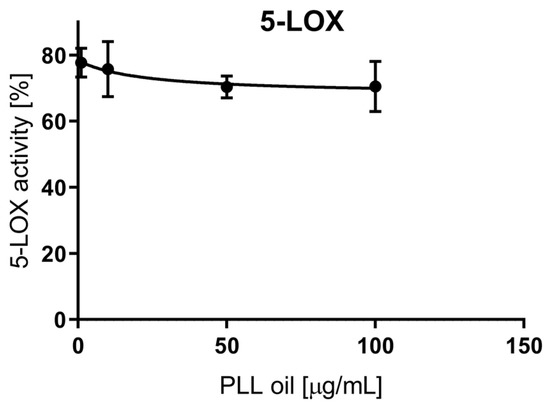The measured values were related to a control sample, which represented 100% enzyme activity, i.e., uninhibited reaction. According to the data (Figure 2), the highest PLL-EO concentration employed (100 μg/mL) did not reach the IC50 value since the activity was lowered by 30% compared to the control. Thus, PLL-EO showed a weak inhibitory effect toward LOX activity. Phenidone (100 μg/mL) used as positive control inhibited LOX activity by 63.4 ± 8.6%.