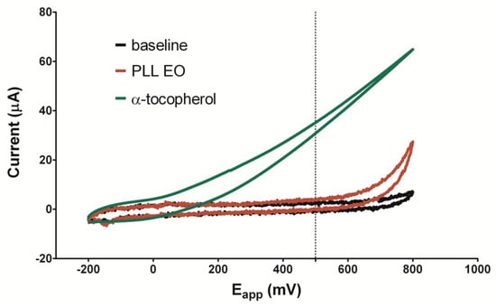 Cyclic voltammetry of PLL-EO with a scanned potential range (Eapp) between −200 mV and +800 mV vs Ag/AgCl reference electrode, in the absence (black line) and in the presence of 200 mg/mL PLL-EO (red line), in comparison with 1 mM α-tocopherol (green line).
