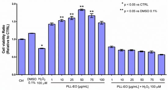 The protective effects of PLL EO toward the oxidative stress affecting the GF were evaluated by the MTT assay, testing different concentrations of the oil. The results showed a significant increase in cell viability when GFs were treated with 10, 25, 50 and 75 µg/mL of PLL EO in comparison to that observed in the control group and using the DMSO 0.1%. Differently, the cells subjected to the oxidative stress evidenced a vitality drop of about 30% in comparison to the control, and when PLL EO was administered before the oxidative stress, no beneficial effects occurred (Figure 4).