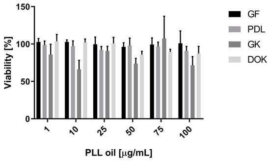 Cytotoxicity effects of increasing concentrations of PLL-EO were recorded for PDLF, GF, GK, and DOK cell lines following a 24 h incubation. The data did not evidence significant differences (p < 0.05) between PLL-EO treated cells and the control. Thus, according to the highest concentration employed in this experiment, it is possible to claim that no toxicity in oral cell lines occurred up to 100 μg/mL of the oil (Figure 5).
