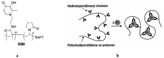 Structure of the DIBI polymer: (a) chemical structure of DIBI; nine 3-Hydroxy-1-(β-methacrylamidoethyl)-2-methyl-4(1H)-pyridinone (MAHMP) residues on a Polyvinylpyrrolidone (PVP) backbone; (b) representation of iron molecules arrangement by DIBI [14]–Reproduced by permission of The Royal Society of Chemistry.
