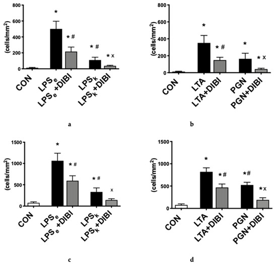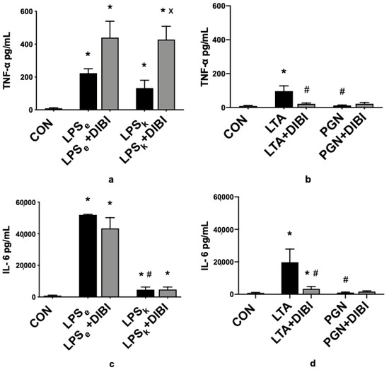 In parallel to increased TNF-α plasma levels, there was a significant increase in IL-6 plasma levels for all groups (LPSe, LPSk and LTA) except animals that received PGN (Figure 3c,d). Furthermore, the E. coli LPS challenge demonstrated significantly higher levels of IL-6 than the K. pneumoniae LPS challenge. The administration of DIBI significantly reduced IL-6 levels in the LTA+DIBI group (p < 0.05).
