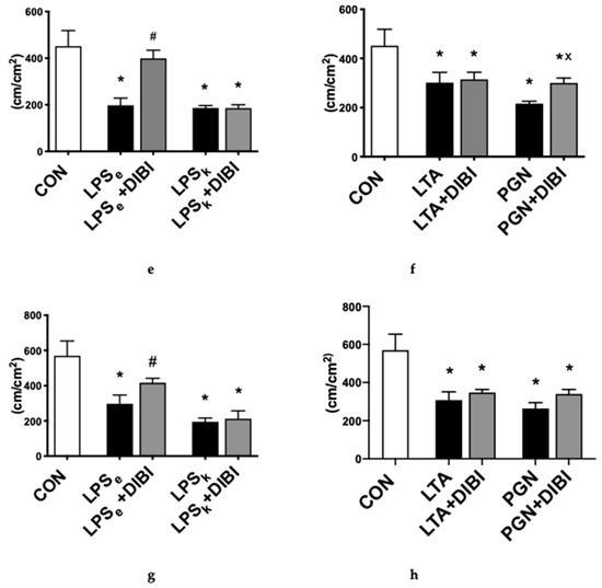 When assessing morphological changes in the intestine, the control group (CON) presented only minor morphological alterations (Chiu score [22]: grade 0–1). Gruenhagen′s spaces at the apex of the villi were observed intermittently (Figure 4b,c). Slightly more Gruenhagen′s spaces were seen at the apex of the villi in untreated Gram-positive toxins, yet there were no significant differences between untreated, DIBI-treated and control groups. However, DIBI significantly increased the Chiu score of the LTA+DIBI and PGN + DIBI-treated groups compared to the control (Figure 4d,e). For the Gram-negative toxins, only LPS from E. coli induced significant damage of the intestinal tissue 3 h after induction of inflammation compared to the control group (Figure 4d). For LPSe-challenged animals, there were more Gruenhagen′s spaces, with some of them extending to the subepithelial layer and inducing epithelial cells loss (grade 2 of Chiu score; Figure 4c). DIBI treatment significantly reduced the damage caused by LPSe. When comparing the two LPS groups, LPSk produced significantly less histological damage than LPSe (Figure 4d).