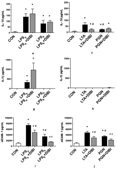 Three hours after toxin administration, a significant increase in IL-10 plasma levels relative to the control group (CON) was observed in all groups (Figure 3e,f). Moreover, the LTA challenge demonstrated significantly higher levels of IL-10 increase compared to PGN levels. DIBI administration significantly reduced IL-10 levels in the LTA+DIBI group (p < 0.05).